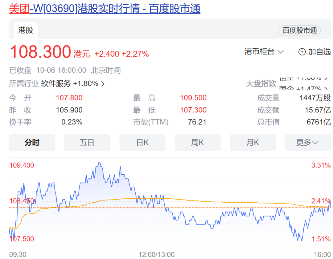 今日科技股集体上涨,美团涨超2%。节假日期间,美团在线平台的消费额跃升。美团发布的“十一”黄金周消费数据显示,全国服务零售日均消费规模较2019年同期增长153%,迎五年来最旺“十一”,上海、北京、成都、重庆、深圳消费规模位居全国前五。