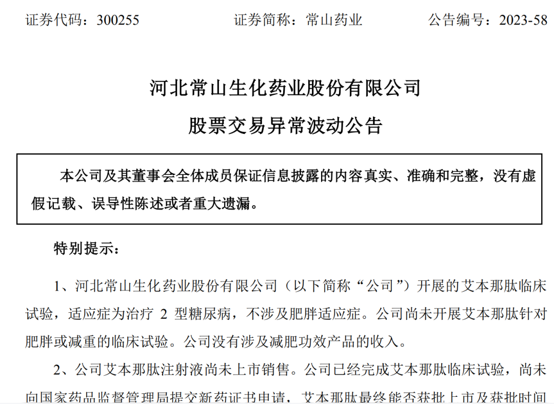 在披露的艾本那肽临床报告中,常山药业也强调,公司目前开展的艾本那肽临床试验,适应症为治疗2型糖尿病,不涉及肥胖适应症。公司尚未开展艾本那肽针对肥胖或减重的临床试验。
