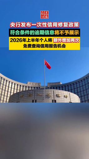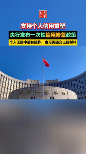 央行:一次性信用修复政策完全免费 无需委托第三方处理