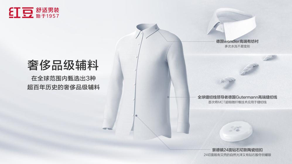 此外,红豆男装还邀请了国际顶级男装品牌Armani前设计副总裁Patrick Grandin共创。双方对于舒适衬衫的追求不谋而合,国际前沿的设计理念融合红豆65年专业制衣经验,为0感衬衫的舒适体验与设计赋能。0感衬衫选用三大奢侈品级别辅料——景德镇陶瓷纽扣、德国Wendler高端有纺衬、德国Gutermann高端缝纫线。一针一线、千锤百炼,处处彰显细节与品质。