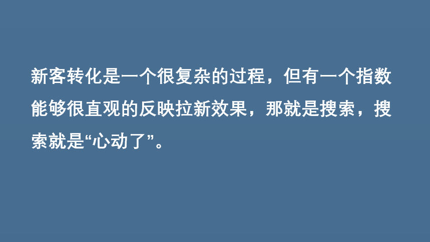 新客转化是一个很复杂的过程,但有一个指数能够很直观的反映拉新效果,那就是搜索,搜索就是“心动了”。
