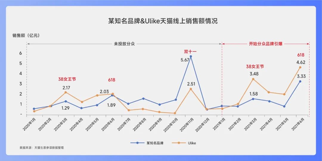 2021年1月,Ulike启动分众的品牌引爆,在2月份这样的淡季,其旗舰店的访客数就已经反超竞品75%,成交金额则反超16%。