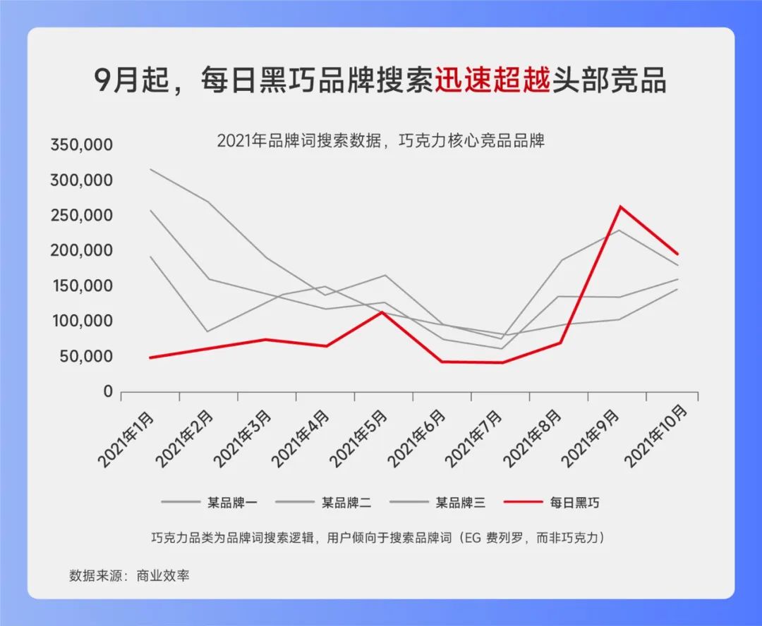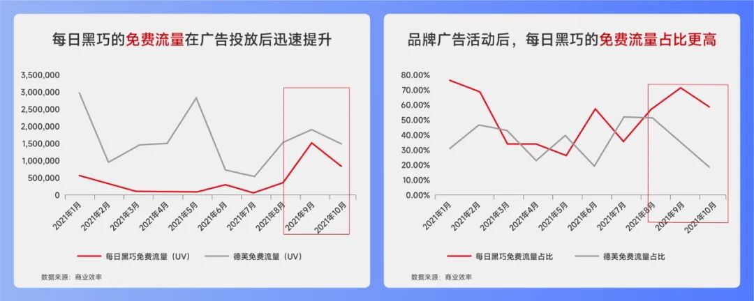 数据显示,从2021年9月、10开始密集投放分众后,每日黑巧的免费流量占比逐渐接近、超过国际品牌,而主动搜索量也超越了国际品牌。