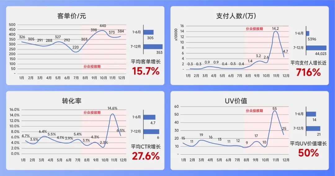 比如,黑白调是儿童家具,属于典型的高客单价+低频产品,客户群体非常定向。所以从整个数据来看,其拉新的效果只有10%的提升,但支付转化率增加了77.5%,客单价大幅增加,交易金额提升314%。