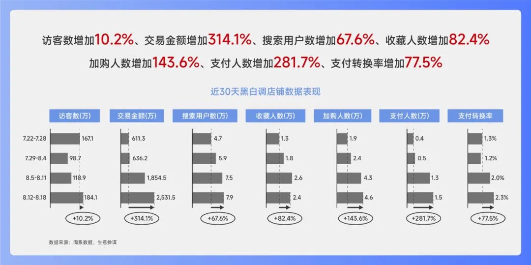 这一举措最终使得其客单价在投放时提升到了3000元区段,而仅仅在投放的30天,其交易指数就反超最主要的第一竞品55%,客单价也超竞品61%,通过下半年的整体品牌引爆,在大盘下滑的背景下,黑白调实现了销量的翻番。
