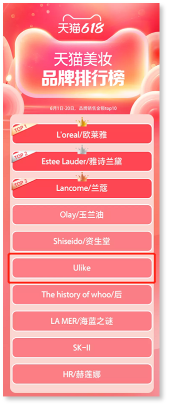 于是Ulike接着投放分众,效果进一步上升。2021年38节旺季,Ulike的访客数是第二名的2.3倍,成交金额是2.2倍;618大促,Ulike成为脱毛仪品类的京东、天猫双料冠军,更成为618唯一进入天猫美妆品牌排行Top10的美容仪类品牌。