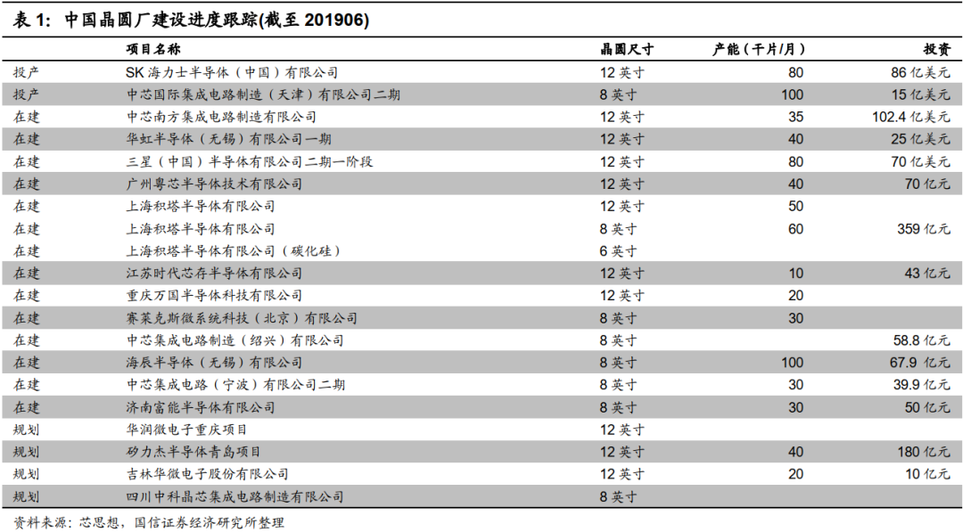 同时,中国也正在开启一轮芯片投资潮。根据芯思想研究院数据显示,截止2019年6月,新建的 20 家晶圆厂中,19 年上半年有2家在建厂完毕逐步投产,12家在建,4家在规划中或新增规划,总计将投入约1177亿元。