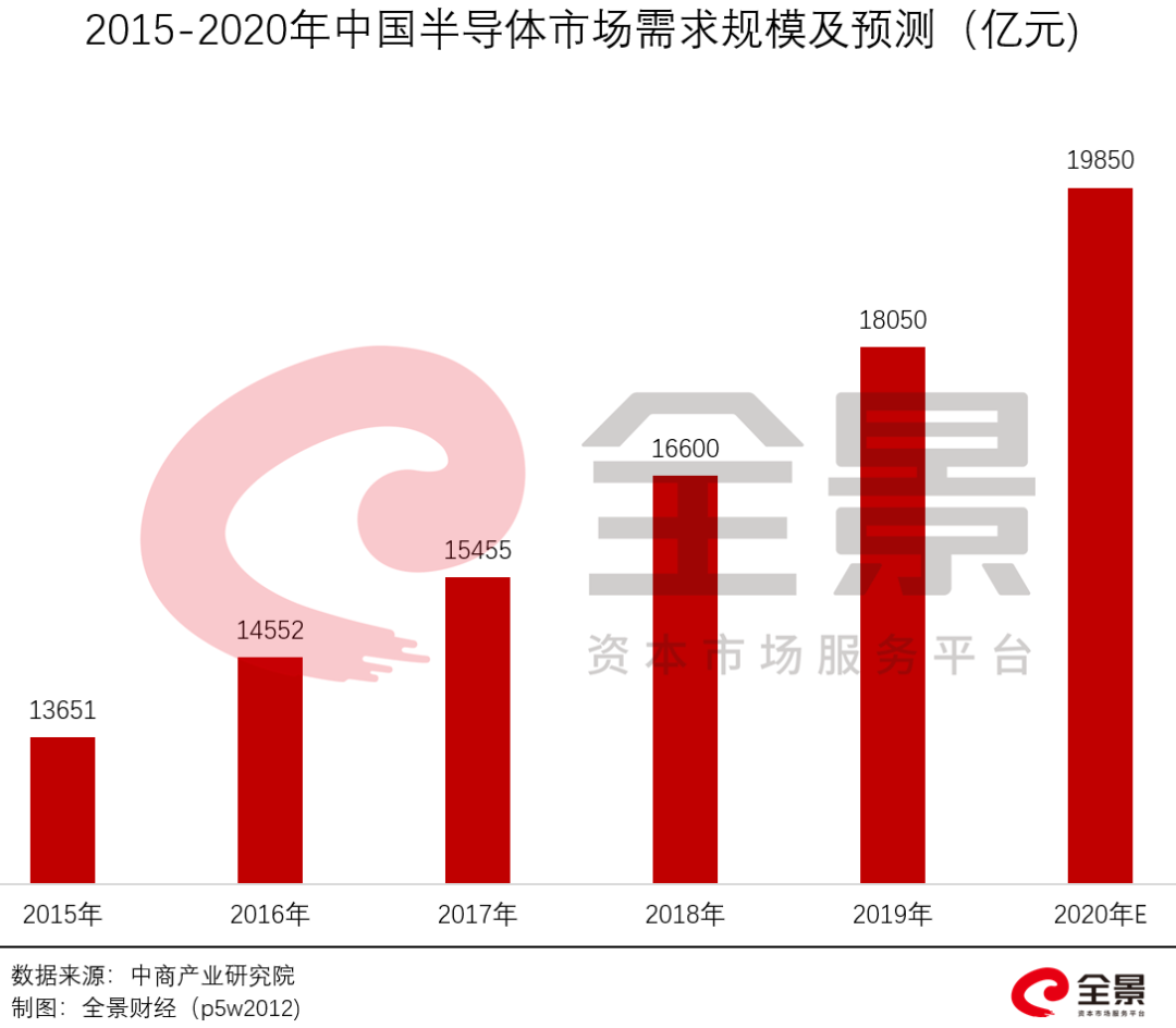 受益于新能源汽车、家电、智能手机等终端的爆发,当前中国是全球半导体需求量最大的市场,预计2020年将达到19850亿元,根据ICInsights的数据,中国的半导体市场需求占了全球市场的30%左右,相当于美国、欧盟及日本的总和。