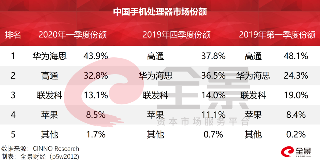 另外,华为海思已经成为中国手机处理器市场第一季度出货量唯一保持增长的主要品牌。海思的出货量为2221万片,同比微增,首次超过高通,以43.9%的市场份额正式成为国内市场出货量最大的手机处理器品牌,反超高通11个百分点。