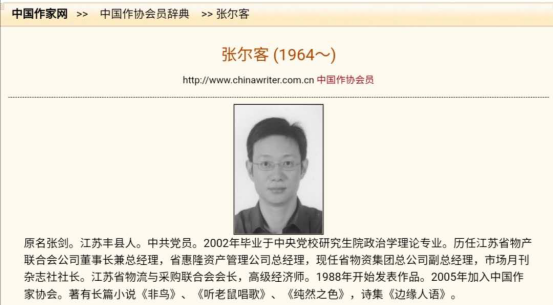 当时的报道同时显示,除了是国企掌门人,张剑还有另一重身份:作家。他在2005年加入中国作家协会,著有长篇小说《非鸟》《听老鼠唱歌》《纯然之色》《欲望的边界》,诗集《边缘人语》《时间与花朵》,并多次荣获全国性诗歌大奖。e公司记住注意到,张剑的笔名为“张尔客”。