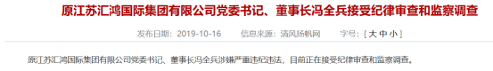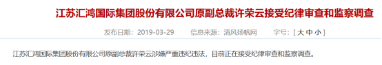 汇鸿集团原副总裁许荣云涉嫌严重违纪违法接受纪律审查和监察调查。他在2018年1月任江苏汇鸿国际集团股份有限公司专务。