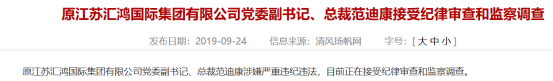原江苏汇鸿国际集团有限公司党委副书记、总裁范迪康涉嫌严重违纪违法接受纪律审查和监察调查。