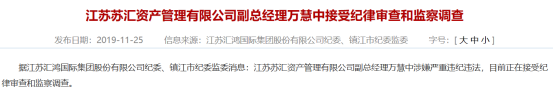 江苏苏汇资产管理有限公司副总经理万慧中接受纪律审查和监察调查。他在2018年曾任汇鸿集团中鼎控股股份有限公司董事长、党委书记。