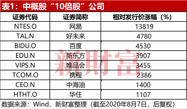 2020年8月10日,网易在港交所二次上市刚好两个月,股价累计涨幅17%。同日,美股开盘前,网易股价为466.5美元,相对IPO发行价累计涨幅超过138倍。美国上市的中概股中,网易是唯一一家“百倍股”公司,“10倍股”以上还有百度、好未来、唯品会和携程等7家公司(表1)。