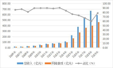 图1:网易游戏2006-2019年收入、占总收入比例