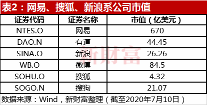 截至7月10日,网易系、新浪系和搜狐系上市公司总市值差距巨大(表2);网易系总市值(714亿美元),是新浪系(111亿美元)6.4倍,是搜狐系(25.4亿美元)大约28倍。若不计算分拆子公司,则网易和新浪、搜狐单独PK,领先优势更大。