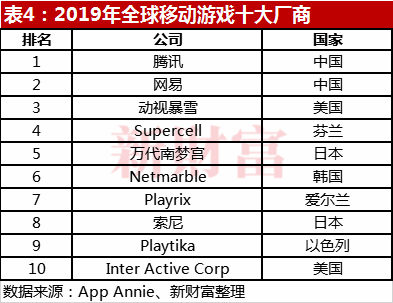 约占游戏市场总规模45%的移动游戏领域,前十名厂商中,腾讯排第一,网易排第二(表4)。