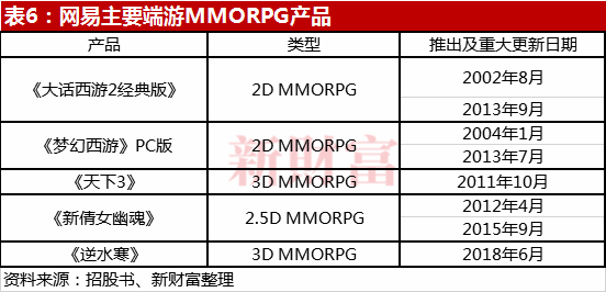 港股招股书中,网易八大自研游戏赫然在列:《大话西游》PC版及手机版,《梦幻西游》PC版及手机版,《阴阳师》系列,《荒野行动》,《第五人格》,《逆水寒》。其中,《大话西游》、《梦幻西游》、《逆水寒》均属于MMORPG(大型多人在线角色扮演游戏)。《大话西游》2002年诞生,至今超过18年,仍有生命力;《梦幻西游》上线也有16年(表6)。