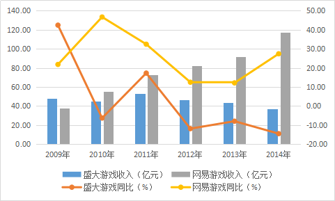 图5:网易游戏、盛大游戏2009-2014年收入对比