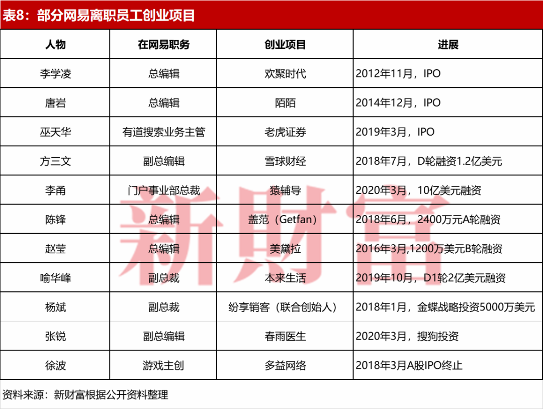 网易系高管创业者不少,且有多家公司上市,如前总编辑唐岩创办的陌陌(MOMO.O)、前总编辑李学凌创办的欢聚时代(YY.O)、曾负责有道搜索的巫天华创办的老虎证券(TIGR.O)(表8)。