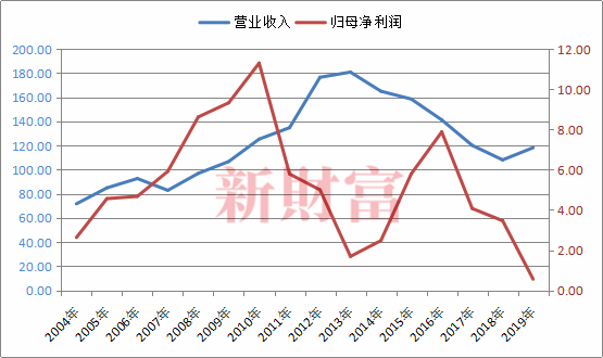 图3:2004-2019年哈药股份营业收入和归母净利润变化情况(亿元)