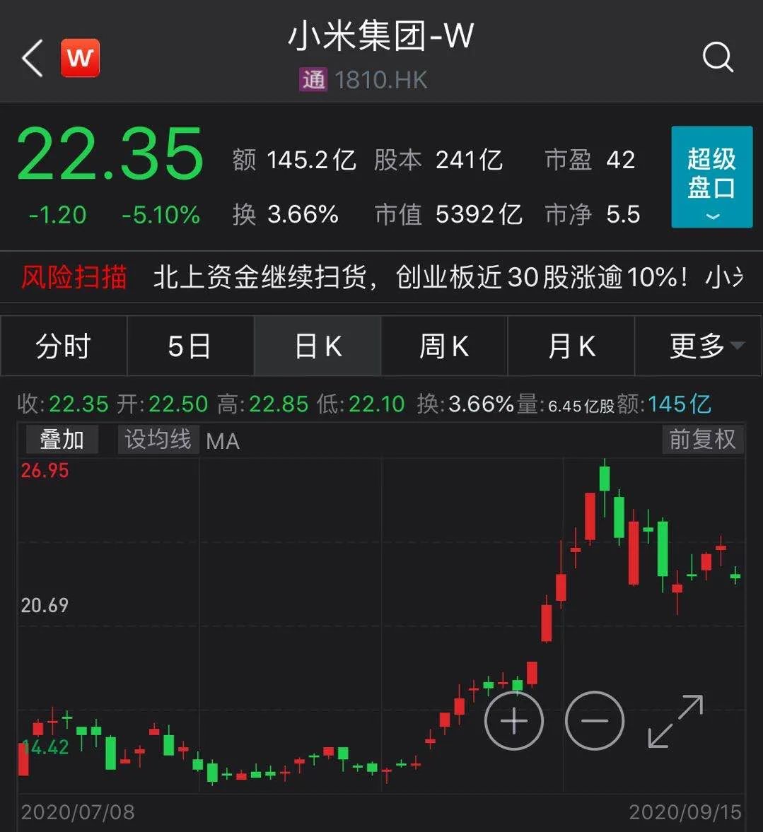 受此消息影响,小米集团今日(9月15日)股价低开并一度跌逾5%,截至收盘,报22.35港元/股,总市值5392亿港元。