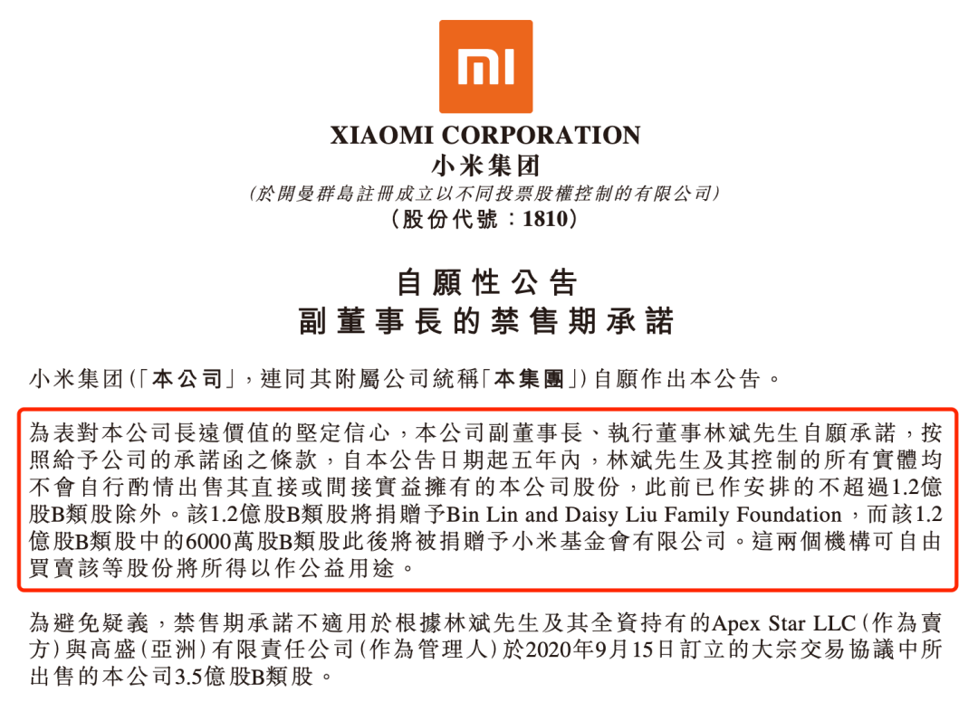 针对林斌此番减持,小米紧急发布禁售期承诺,林斌剩余股份会锁定五年,即自9月15日起五年内,林斌及其控制实体均不会再出售股份,此前已安排捐赠给家族慈善基金的1.2亿股B类股除外。