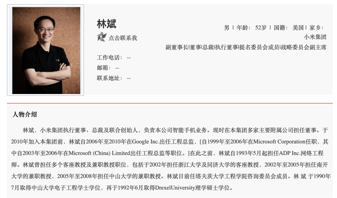 公开资料显示,林斌目前担任小米集团执行董事、总裁及联合创始人,负责小米集团智能手机业务。
