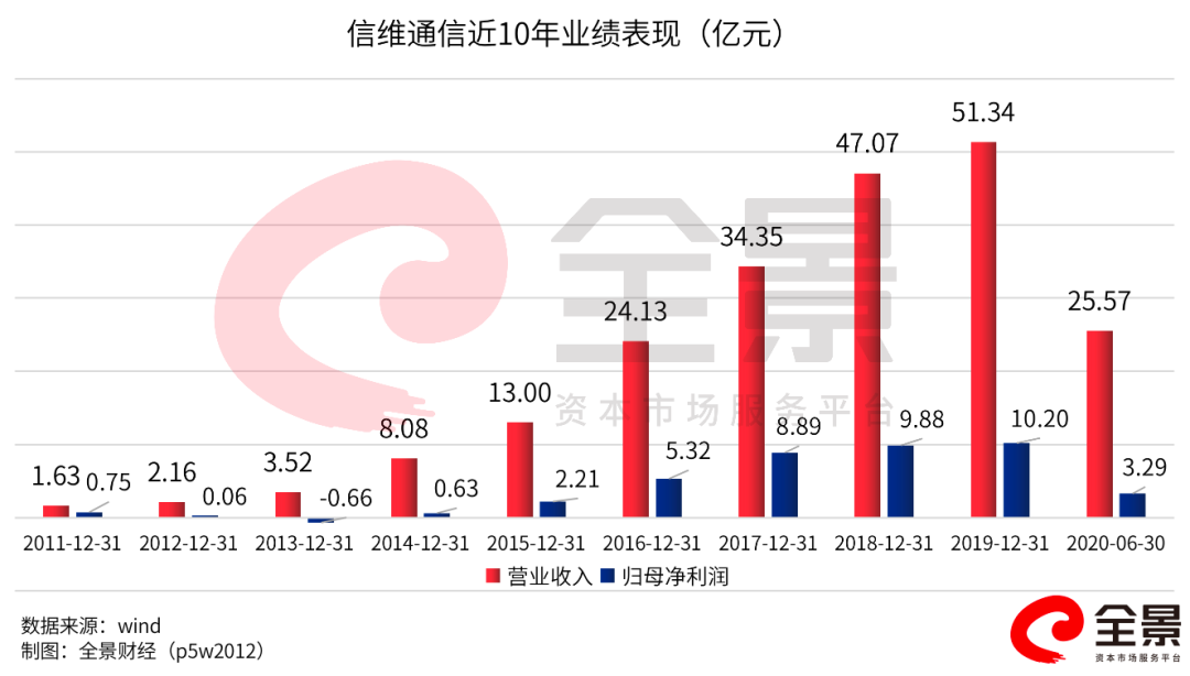 自上市以来,信维通信业绩保持良好的增长趋势,营收从2011年的1.6亿元增长至2019年的51.3亿元;归母净利润从2011年的0.75亿元增长至2019年的10.20亿元。