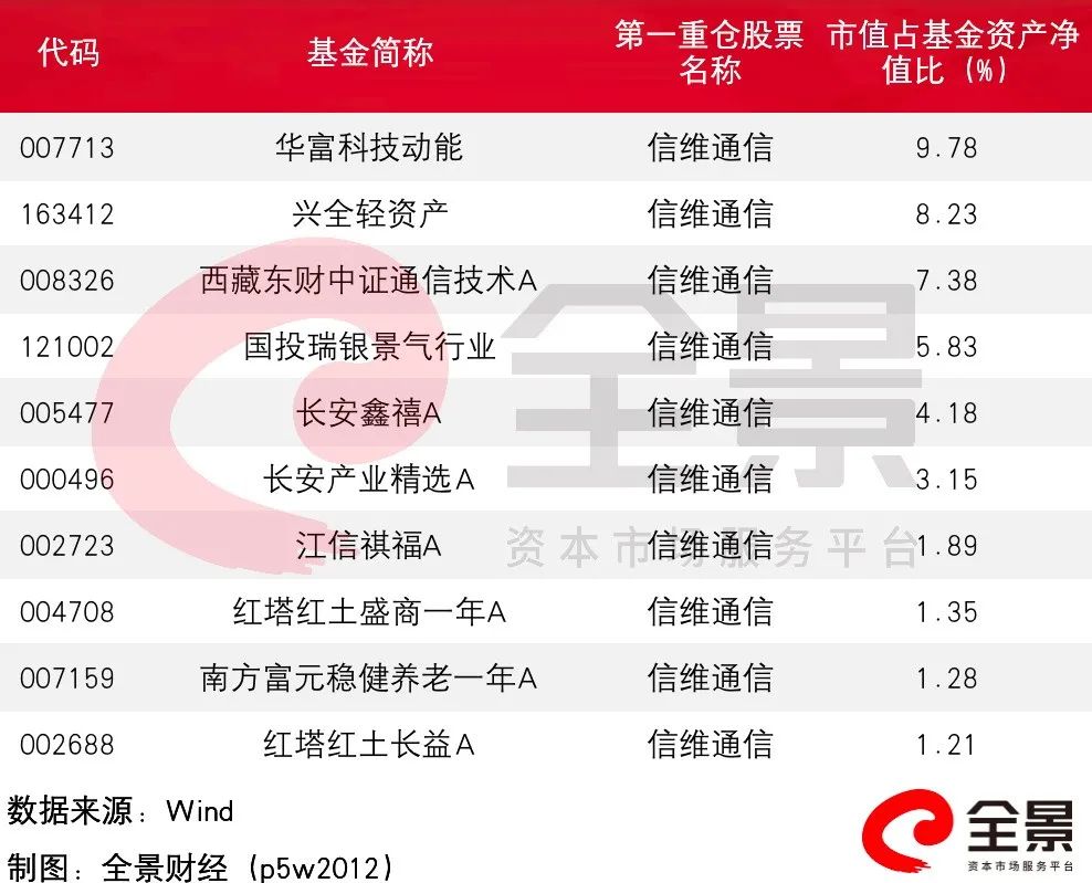另外,从基金中报第一大重仓股看,有10只基金第一大重仓股为信维通信,其中有3只基金持有信维通信市值占基金资产净值比超过了7%,分别是华富科技动能、兴全轻资产和西藏东财中证通信技术A。