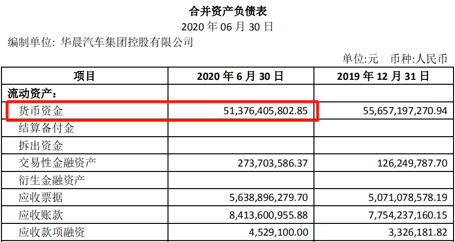 其财报显示,2020年上半年,华晨集团实现营收846亿元,净利润63亿元。截至6月底,华晨集团总资产达1933亿元,净资产约604亿元。货币资金同样高达513.76亿元。