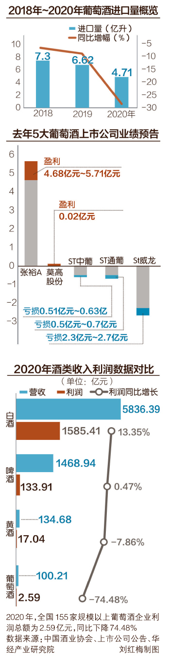今年全国两会期间,《关于取消葡萄酒消费税,振兴葡萄酒产业的建议》提交大会。提交建议的是国产葡萄酒龙头张裕的董事长周洪江。数据显示,2020年国产葡萄酒企约实现利润2.6亿元,如扣除张裕约5.2亿元利润,全行业大面积亏损已是现实。