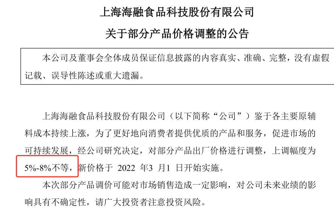 1月4日晚海融科技公告,鉴于各主要原辅料成本持续上涨,为了更好地向消费者提供优质的产品和服务,促进市场的可持续发展,经公司研究决定,对部分产品出厂价格进行调整,上调幅度为5%到8%不等,新价格于3月1日开始实施。