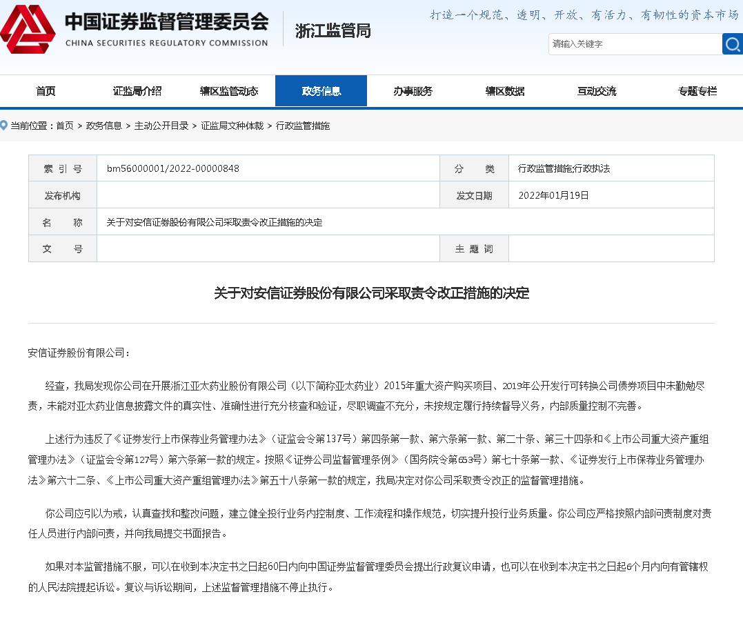 经查,浙江证监局发现安信证券在开展亚太药业2015年重大资产购买项目、2019年公开发行可转换公司债券项目中未勤勉尽责,未能对亚太药业信息披露文件的真实性、准确性进行充分核查和验证,尽职调查不充分,未按规定履行持续督导义务,内部质量控制不完善。浙江证监局局决定对公司采取责令改正的监督管理措施。