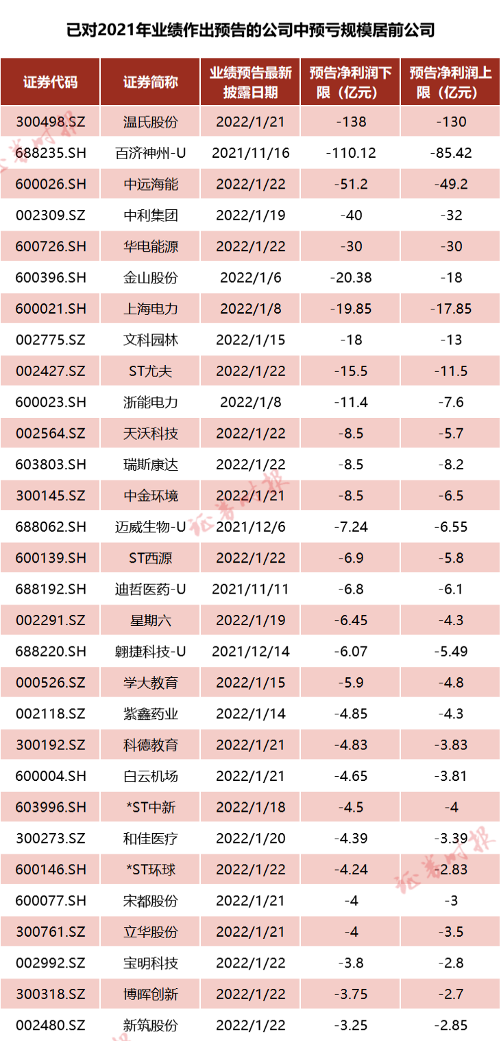 这里面,温氏股份、百济神州-U、中远海能、中利集团、华电能源、金山股份、上海电力、文科园林、ST尤夫等公司预亏规模居前。