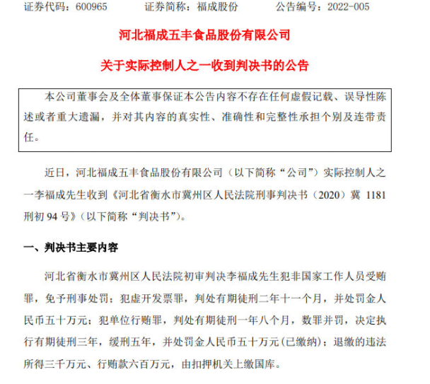 1月28日晚,福成股份(600965)公告,公司实控人之一的李福成因犯行贿罪、虚开发票罪等被判有期徒刑三年,缓刑5年。