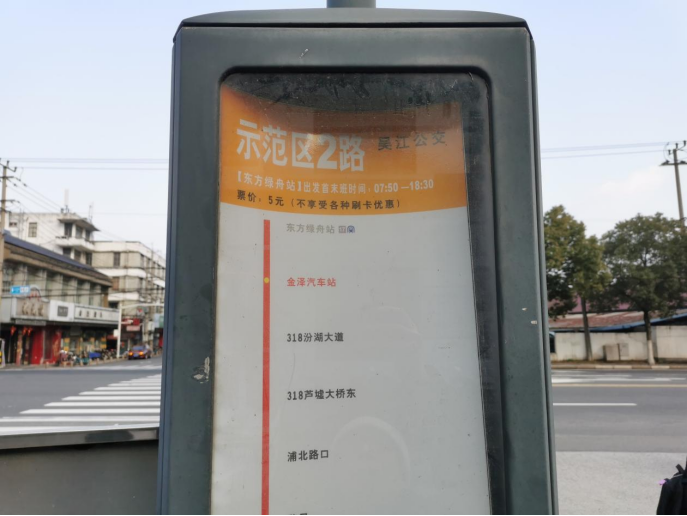 (上海金泽汽车站“示范区2路”站牌,运营方为苏州吴江公交公司)