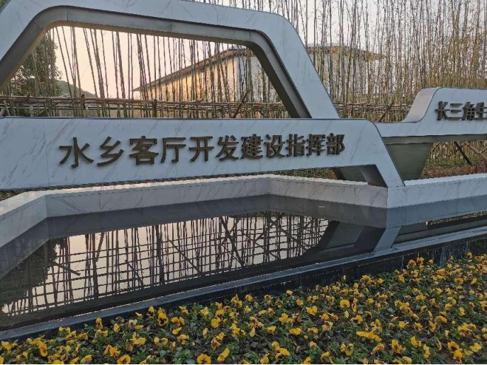 路边的“水乡客厅开发建设指挥部”标牌。入口处的安保人员告诉记者,这里面还有展览馆,但恰好从1月30当天开始闭馆,预计2月6日重新开放。他透露,此处并不是对社会公众完全开放的。
