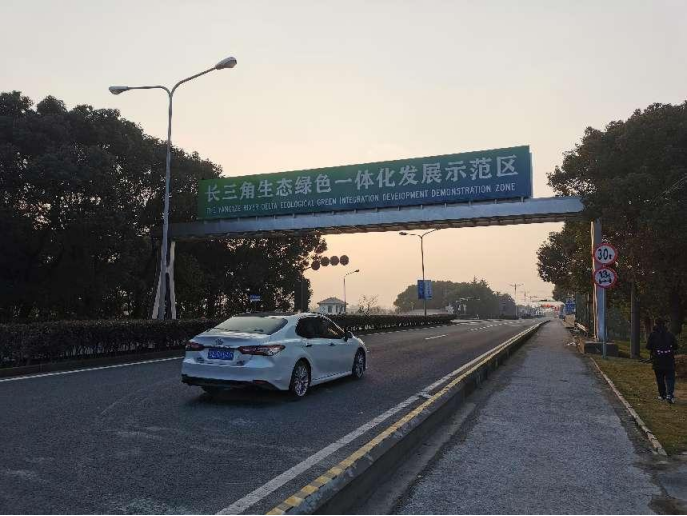 在路途上,可以看到类似长三角生态绿色一体化发展示范区的宣传标语,如“逐梦一体化、奋进两周年”“共享一体化机遇、共推高质量发展”及“制度创新实验田、跨域一体新标杆”等等。