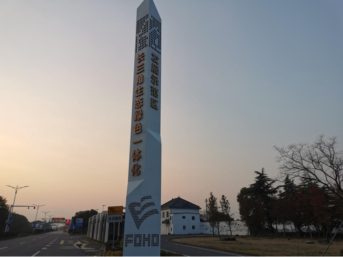 (屹立在江苏一侧的纪念碑,上写“三角生态绿色一体化发展示范区”)
