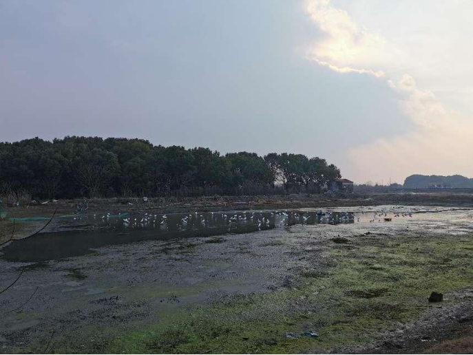 午后4时许,记者在村庄中见到一大片类似沼泽的湿地。华东地区太阳起得早落得也早,此时已经夕阳微沉,湿地中大片白鹭在休憩。记者走过时,将这群鸟儿惊得一齐向天边飞去。