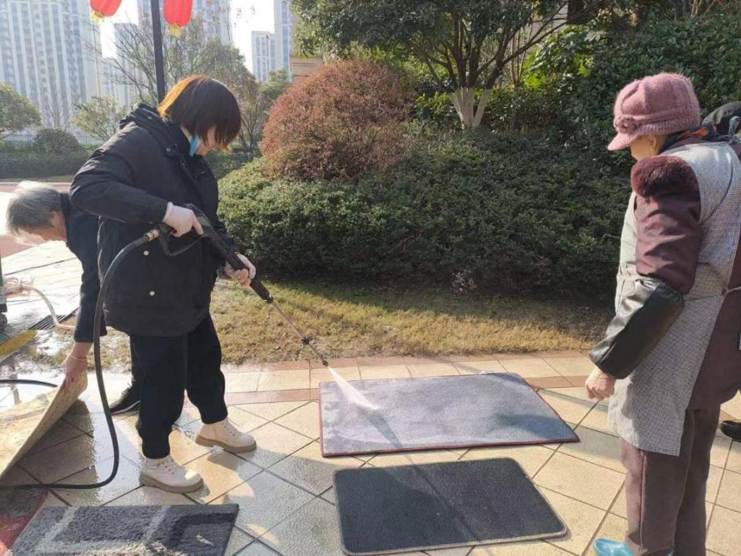 为答谢全体业对宋都服务一直以来的理解、支持与配合,年前物业工作人员开展了免费帮业主清洗门垫的服务。一大早物业全体员工齐齐上阵,有顺序铺好业主送来的门垫,细致地用高压水枪冲洗干净。