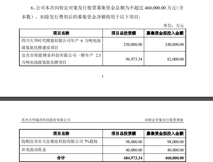 也正是在此背景下,天华超净决定推出本次定增预案,拟投资“四川天华时代锂能有限公司年产6万吨电池级氢氧化锂建设项目”、“宜宾市伟能锂业科创有限公司一期年产2.5万吨电池级氢氧化锂项目”。其中前者位于四川省眉山市,项目总投资25亿元,拟投入募集资金24亿元;后者位于四川省宜宾市,项目总投资9.70亿元,拟投入募集资金8.2亿元。