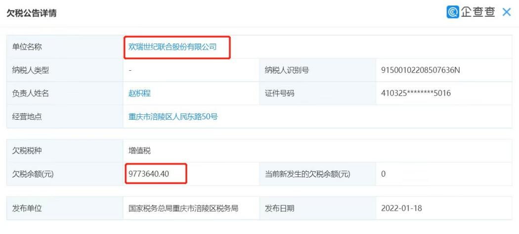 2月10日,企查查APP最新显示,欢瑞世纪联合股份有限公司新增欠税公告,金额超977万,欠税税种为增值税,发布单位为国家税务总局重庆市涪陵区税务局。