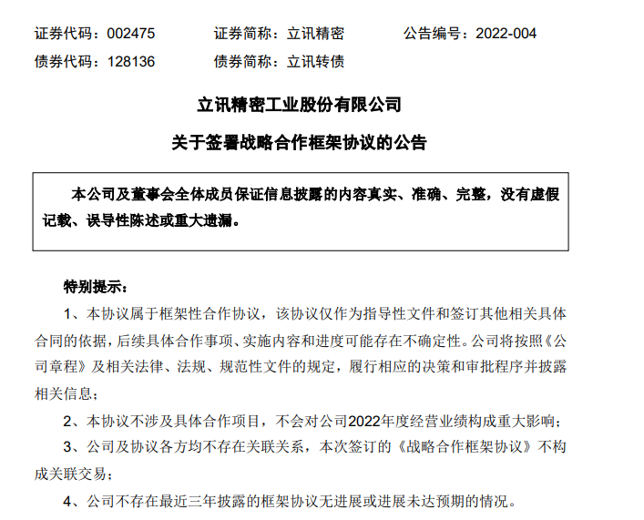 2月11日晚,立讯精密公告,当日,立讯精密与奇瑞控股集团有限公司(下称“奇瑞控股”)、奇瑞汽车股份有限公司(下称“奇瑞股份”)、奇瑞新能源汽车股份有限公司(下称“奇瑞新能源”)(“奇瑞控股”、“奇瑞股份”、“奇瑞新能源”及其关联方合称“奇瑞集团”)于芜湖共同签署了《战略合作框架协议》,为双方奠定战略合作伙伴关系。