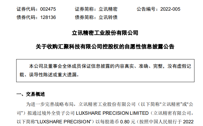 与上述公告同步,11日晚间,立讯精密同步出炉收购汇聚科技控股权之公告。