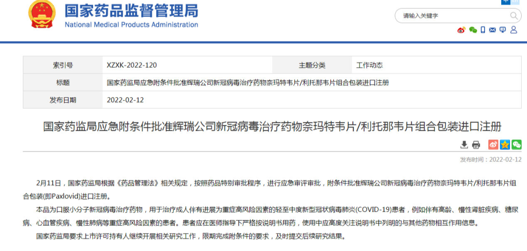 据国家药监局网站消息,2月11日,国家药监局根据《药品管理法》相关规定,按照药品特别审批程序,进行应急审评审批,附条件批准辉瑞公司新冠病毒治疗药物奈玛特韦片/利托那韦片组合包装(即Paxlovid)进口注册。