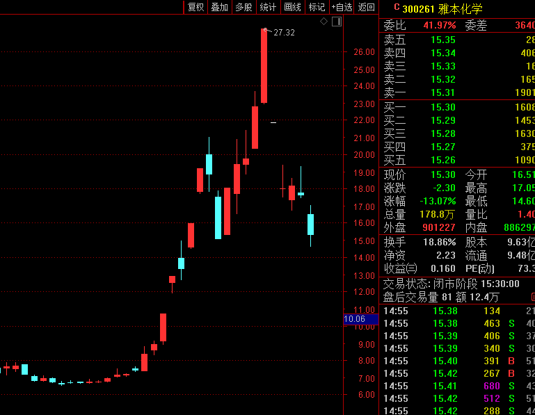 其中,2021年11月1日至2022年1月14日,雅本化学沾上“辉瑞概念”后,股价从5元附近开始暴涨,期间连续收获20CM涨停,累计涨幅达432.55%,成为跨年度行情A股表现最亮眼的大牛股之一。因为股价连续异常波动,雅本化学两度紧急停牌,并多次收到交易所关注函。不过,2月7日复牌后,雅本化学出现连续暴跌走势。