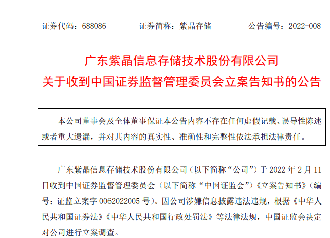 2月11日晚间,紫晶存储(688086)突发公告,公司当日收到中国证监会立案告知书。