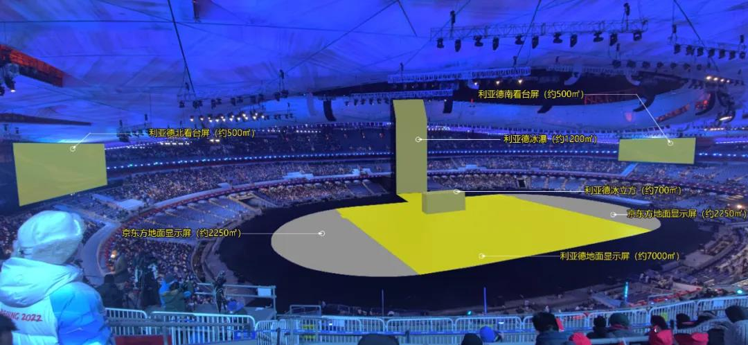 利亚德方面还专门制作了现场屏幕供应商图例。其中显示,开幕式地屏作为全世界最大的LED屏幕,面积约11500平米,利亚德提供7000多平方米(图中地屏中央黄色部分)。为舞台增艳的1200多平方米的冰瀑,700多平方米的冰立方,以及约1000平米的鸟巢南北两侧实况转播屏也由利亚德提供(下图深黄色部分)。
